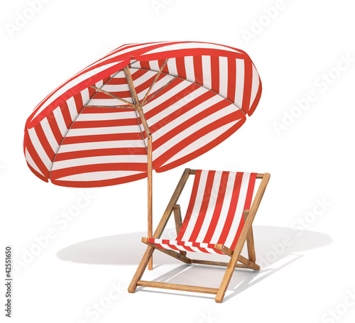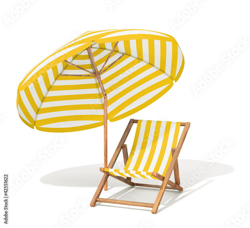 Features beach chair and umbrella subject.